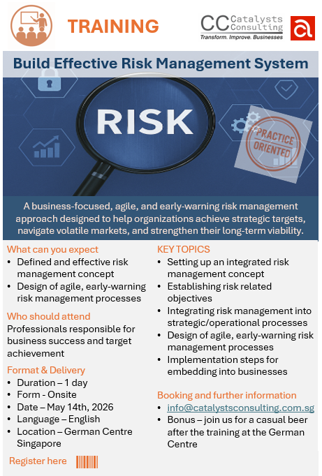 Participants will gain a clear understanding of the defined requirements for risk management and explore all elements of an effective system. The training introduces an integrated concept that aligns risk management with strategic and operational steering processes. You’ll learn how to design agile, early-warning risk management processes and define clear responsibilities for managing risks.